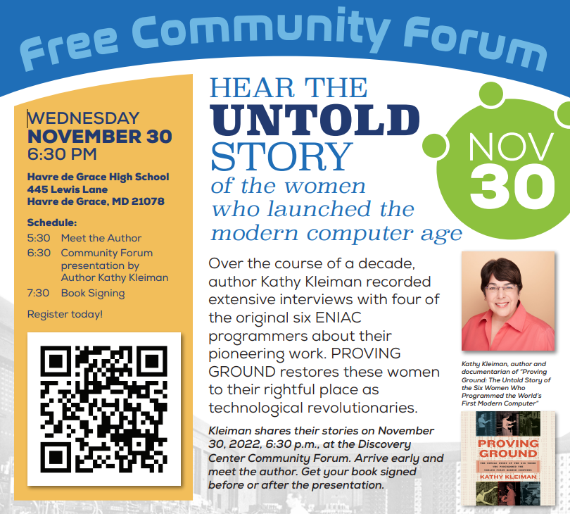 Join the Maryland Women’s Heritage Center, the Historical Society of Harford County and Discovery Center at Water’s Edge as we add “HERStory to history to tell OURstory” and welcome Kathy Kleiman to a free community forum to discuss Proving Ground.