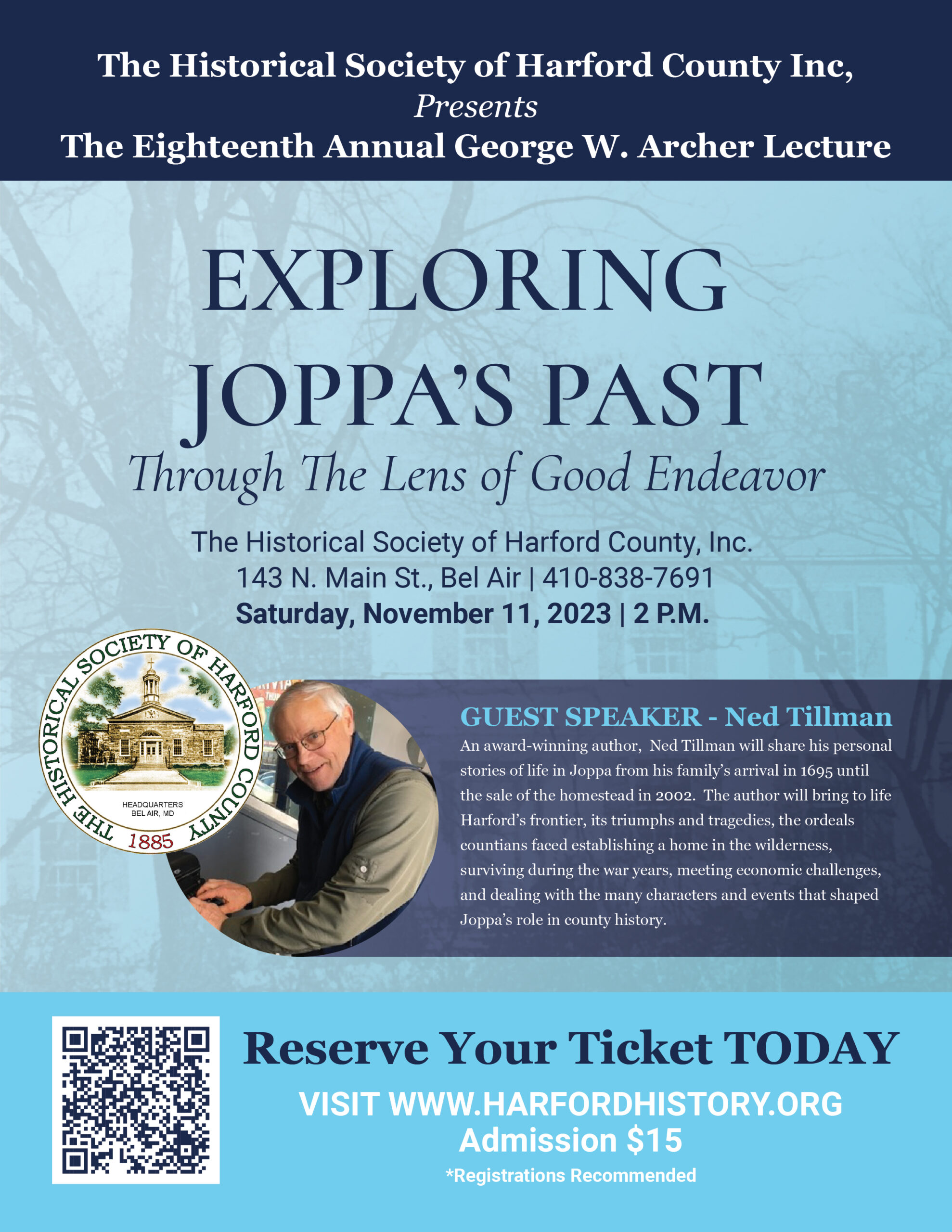Each year the Historical Society concludes its Speakers Series with the Archer Lecture, named for one of the society’s prominent founding members. The speakers are generally chosen from local authors who have contributed in a very special way to our understanding of Harford’s history. We are pleased to announce this year’s speaker will be Judge...
