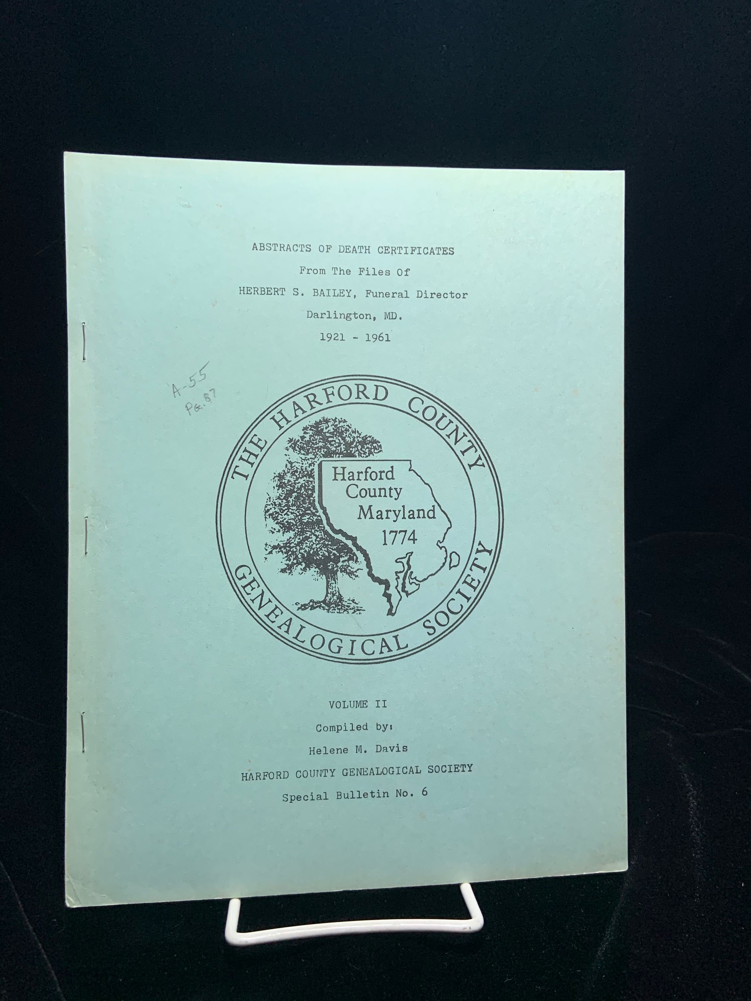 Abstracts of Death Certificates From the Files of Herbert S. Bailey, Funeral Director, Darlington, MD, 1921-1961 Volume II.  Compiled by Helene M. Davis.  Harford County Genealogical Society.  Special Bulletin 6.  Digital