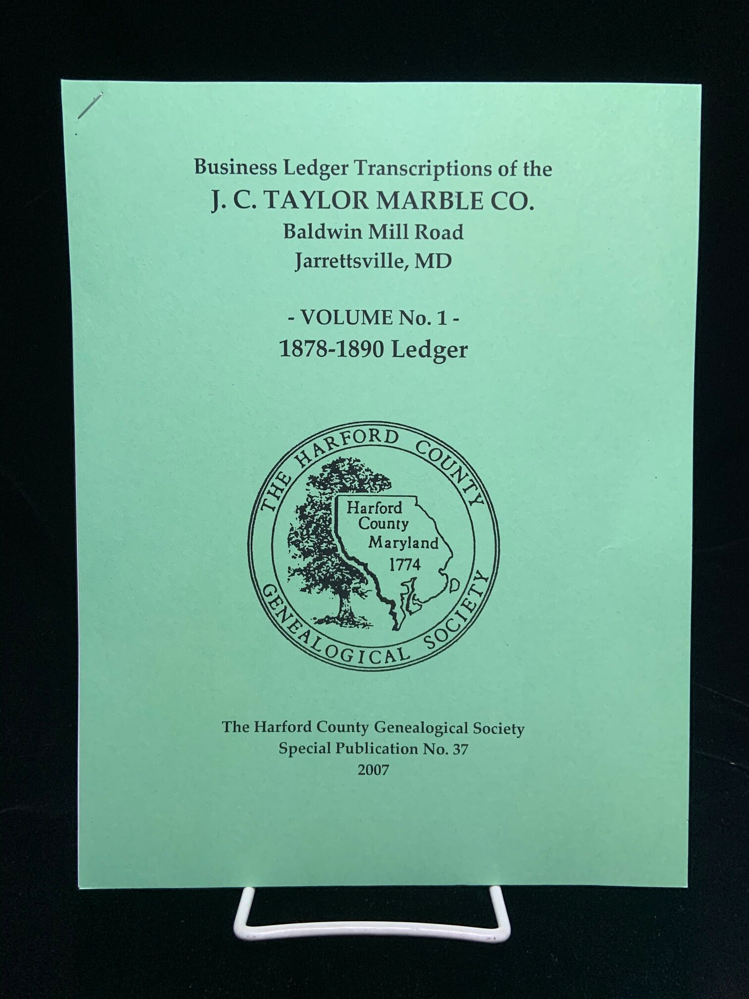 Business Ledger Transcriptions of the J. C. Taylor Marble Co. Baldwin Mill Road, Jarrettsville MD . Volume Number 1, 1878-1890 Ledger. Special Publication 37 by The Harford County Genealogical Society. Due to low inventory a photocopy may be provided.