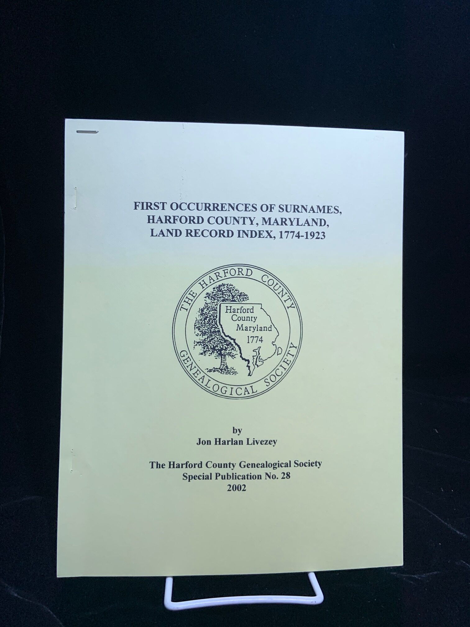 First Occurrences of Surnames, Harford County, Maryland, Land Record Index, 1774-1923, by Jon Harlan Livezey, Special Publication Number 28, The Harford County Genealogical Society.